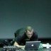 Dernière partie, Russel Haswell, seul, accroupi par terre. Il lance une petite musique ambient et abandonne la scène. Il revient avec des munitions, soit deux canettes de bière, sous les applaudissements. Il jette sous blouson à terre et s’installe derrière son laptop, comme un gain dans sa chambre s’amusant avec ses jouets.