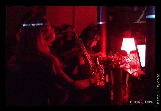 Ces présentations faites, passons à la musique : comme souvent avec ce type de configuration (musiciens relativement nombreux, musique improvisée), la réussite d’un concert réside en grande partie dans le dialogue, et donc l’écoute, qui s’opère entre chacun des protagonistes. De là découle le fait que chacun (chacune en ce qui concerne cette soirée) y trouve sa place, apporte sa contribution, et parvient à réagir aux propos de ses comparses. Les quatre musiciennes œuvrant dans un registre plutôt minimaliste, on avait peu de risque d’en voir une prendre le dessus. Au contraire, elles paraissent toutes les quatre toutes timides, délivrant de petits sons faisant preuve d’une grande finesse. De la dentelle improvisée, faite de chuintements du saxophone, de souffles frétillants, de drones flottants, de grincements proches du violoncelle, des frottements d’objets au rendu quasi aquatique, des éléments mis en boucle. Bien sûr, comme souvent il était plus facile d’apprécier le travail des instruments acoustiques, plus visuels, avec de nombreux dialogues entre les interjections du saxophone de Christine Sehnaoui et les cordes délicatement frappées par les baguettes de Clare Cooper. On a généralement l’impression d’entendre un field recording, une ambient fourmillante de vie, créée par cette multitude de sonorités.