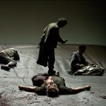 Quatre personnages errent sur scène, tenant des propos épars et incohérents : une femme tente de détrousser un cadavre qui se refuse à mourir, un homme âgé perd la tête et un autre, plus jeune, ne sait plus qui il est. Leurs histoires individuelles sont racontées par fragments, générant des béances dans le récit, qui vont légèrement se combler vers la fin même si la confusion continuera de prédominer et de dérouter le spectateur, plongé dans la semi-obscurité du plateau, telle que les visages (couverts de boue, qui plus est) sont difficilement distinguables. Puisque, dans cette vision apocalyptique de l’avenir, les rapports humains et le lien social tendent à disparaître, les objets se trouvent surinvestis et sont alors chargés de remplir cet office d’attache entre les personnages : pistolet qu’on se passe de main en main, manteau qu’on s’arrache, pull qu’on somme d’étrangler le presque-mort, etc…