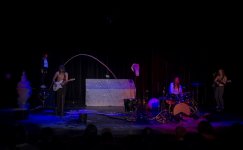 Programmé au sein du festival Mesure Pour Mesure, manifestation ambitionnant de mêler théâtre et musique, Fruits of Labor tient en réalité de la performance musicale, entre concert et geste débridé, fatras posé sur scène et recherche plastique. Conçu par Miet Warlop, présente sur scène aux côtés de deux musiciens et deux autres comédiens, le spectacle se constitue en vérité d’une suite de séquences chantées ou (parfois) instrumentales dans lesquelles les interprètes rivalisent d’inventivité, mettant en place procédés ingénieux (ces éléments de batterie jouant tous seuls, ce jet d’eau qui tombe pile au bon endroit…) et effets spéciaux bricolés.