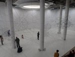 De fait, Tomás Saraceno a initié le projet « Aerocene », communauté choisissant d’investir les airs, maintenant que la terre a basculé dans l’anthropocène, les humains marquant durablement l’évolution de la planète. Tentatives de mises au point d’objets volants grâce à des énergies non fossiles ou réutilisation de sacs plastique pour construire un musée volant : les idées ne manquent pas, à ce stade, dans une démarche inventive et bricolée qui peut toutefois prêter à sourire. Pour le spectateur qui aura préféré les recherches plastiques autour des toiles, des fils et des particules de poussière, la visite pourra se conclure (en ayant pris son ticket suffisamment en amont, dès son arrivée au Palais de Tokyo, par exemple) par un passage dans la salle Algo-R(h)i(y)thms où chacun est invité à pincer de fines cordes pour produire une musique ambient, principalement à base d’infra et ultra-sons.