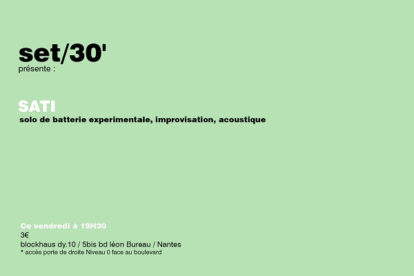 S’emparant de pierres de petites tailles, il les frotta l’une contre l’autre, avant de faire de même avec les plus grosses pierres disposées sur sa caisse claire détimbrée et sur un tom. Rejoints par des coups de grosse caisse, ces frottements se muèrent en cliquetis minéraux très probants, à mesure que Sati accélérait ses mouvements. Plus tard, ce fut une petite cymbale dont il frotta la tranche à l’aide d’un court archet, en même temps qu’il la faisait tournoyer sur un de ses toms, ou bien une plus grande cymbale caressée fortement par une pointe de baguette, pour produire des sons entre crissements et traits métalliques lacérant l’air.