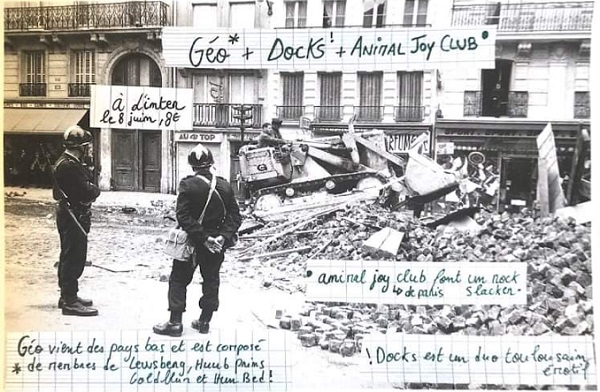 À nouveau de passage à Paris, et à nouveau à l’International, le duo Docks se rendait dans la capitale pour y fêter la sortie de leur nouveau single, Lilas, publié dans un format assez classieux (un flexi-disc en forme de carte postale, avec la face arrière cartonnée, pour pouvoir y écrire ou dessiner, comme sur une vraie carte postale). Bien familier du groupe toulousain, on se dépêcha de quitter le bureau, afin d’être à 20h dans le bar d’Oberkampf, ne voulant pas rater les deux musiciens, tout en évitant le reste du plateau (toujours aussi bigarré, puisque post-punk et slacker-rock étaient ensuite au programme).