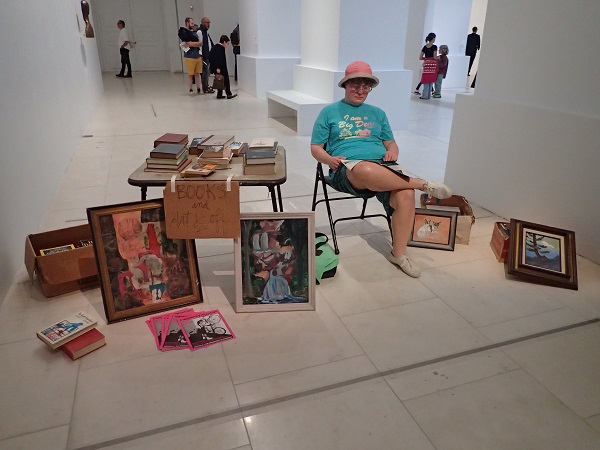 Clou de l’exposition, présente sur tous les supports de communication, et fierté de l’institution nantaise qui la détient dans ses collections, la Flea Market Lady est installée au milieu du parcours. Assise sur sa chaise de camping, plongée dans un magazine en attendant le badaud, entourée de livres et peintures, l’œuvre de Duane Hanson semble, a fortiori en cette période estivale aux multiples vide-greniers, d’un réalisme confondant. Comme précédemment, avec les sculptures citées en premier, cette impression se fait d’autant plus forte que le personnage ne nous regarde pas, ayant l’éternité devant elle et paraissant défier le temps.