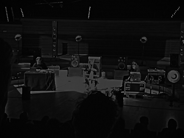 Après avoir basculé dans l’Auditorium, complet (comme tous les plateaux de ce week-end d’anniversaire), le public put assister à un trio dont c’était, semble-t-il, la première prestation commune. Constituée de trois musiciens très renommés, fidèles de Présences Électronique comme de ces pages (Christian Fennesz est possiblement le musicien dont le plus grand nombre de concerts est chroniqué), cette formation mêlait les guitares et machines des deux hommes au violoncelle électrique de l’Islandaise, positionnée au centre du trio.