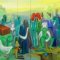 La distance ainsi mise entre enfant et mère se retrouve dans le papier peint Mama told me not to come de Rosemarie Trockel avec cette scène d’intérieur des années 70, où l’enfant au premier plan, assis dans un fauteuil club, est net alors que la mère, à l’arrière-plan, reste dans le flou. Pour autant, elle ne peut s’empêcher de fixer l’appareil-photo, dans une forme de contrôle et de mainmise qui contraste avec l’apparente douceur de la composition et de ses nimbés vaporeux. Même ambivalence dans les peintures de Sebastian Wiegand, plus réalistes, mais dans des intérieurs à la temporalité voisine (avec couleurs orange et marron caractéristiques), dans lesquelles la volonté de retracer les luttes politiques de l’époque paraît laisser le pas à une forme de lassitude, ou d’épuisement, de la mère, affalée sur un sofa et exténuée.
