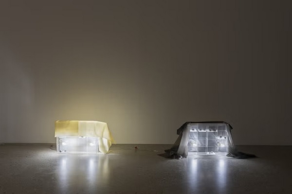 En parcourant les lieux, on est saisi par le minimalisme ascétique des propositions avec une absence de cartel, des œuvres positionnées à même le sol ou sobrement installées, et une impression d’être face à des créations low-tech façon début du siècle présent : ordinateurs mis à l’horizontale et montrant, grâce à des caméras endoscopiques, l’intérieur des cloisons (Triple Insert d’Alexandre Khondji) ; vitrines éclairées de l’intérieur et garnies de perles, de photos ou de velours chez Hélène Yamba-Guimbi. Toutefois, peu à peu, des bribes narratives sont mises au jour : de la vie semble apparaître dans les interstices du bâtiment, des sortes de mises en fiction naissent de la contemplation des vitrines (telle ce Foreign qui, avec ses cases, pourrait figurer un immeuble et ses appartements), un murmure chamanique s’entend, en provenance du film de Saodat Ismailova qui clôt la visite. Centré sur la figure d’un philosophe perse du XIIe siècle, 18 000 Mondes, long d’une demi-heure, invite à la contemplation et à l’introspection, en conclusion finalement assez logique de ce parcours de découverte.