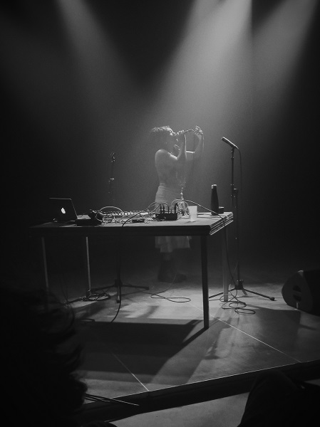 Assise derrière ses machines, la Californienne lança un bourdon, rejoint par des notes graves données par son basson, capable aussi de servir de vraies lignes mélodiques. L’écho sur cet instrument donnait un caractère aérien à l’ensemble, tandis qu’un côté un peu mystérieux résultait de la combinaison de la fumée et des lumières bleues venant de derrière la jeune femme. Joy Guidry superposa ensuite une deuxième ligne de basson à la première, puis tritura les deux à l’aide d’un séquenceur, de la saturation de quelques basses et de la pose de grésillements. Même dans une telle configuration, le propos maintenait son aspect langoureux comme la profondeur du geste et du souffle.