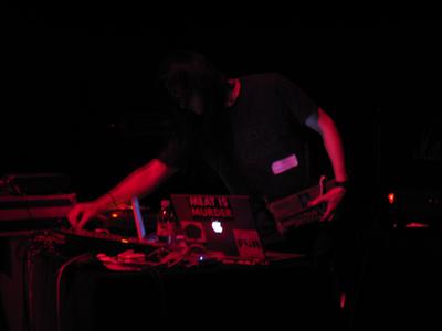 Peu après 21h, quand on rentre dans la salle de concert du Palais de Tokyo, K. oZ a déjà commencé à produire un boucan épouvantable. C’est très bien arrangé : des sons de larsens s’entrechoquent, reliés par une ligne de basse rapide. Il s’en dégage une énergie prenante. Comme un groupe de rock qui maltraite ses instruments à la fin d’un concert, mais plus vite. L’état de grâce dure plus longtemps que pour pas mal de groupes du même accabit, mais au bout d’une demi-heure, tout est quand même dit. Heureusement (?) qu’on a les amplis à regarder cramer les uns après les autres sous les assauts répétés des larsens... On sort, suivis dans les 10 secondes de K.oZ en personne. Va-t-il nous tirer les oreilles ? En avait-il marre lui aussi ? Pas du tout, cela fait simplement partie de son jeu de scène habituel, laisser tourner ses machines, puis retourner exécuter un dernier morceau.