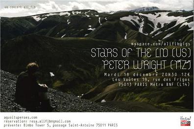 Près de six ans après leur dernier passage en date et alors que l’excellent And their Refinement of the Decline avait paru au printemps, Stars of the Lid firent escale à Paris dans la petite salle des Voûtes. Après plus d’une heure d’attente dans ce glacial froid de décembre en raison d’embouteillages retardant l’arrivée du duo, on put enfin pénétrer dans la pièce pour assister tout d’abord à une prestation du Néo-Zélandais Peter Wright.