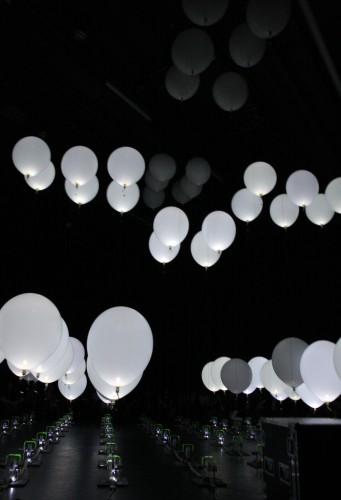Pour l’occasion, le public n’est pas dans les gradins, mais sur scène, tout autour d’une gigantesque installation formée par 64 ballons disposés selon une matrice de 8x8. Ils sont gonflés à l’hélium et flottent à environ 1m du sol, retenus individuellement par un fil.