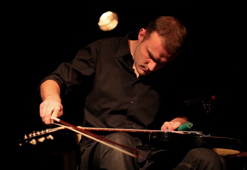 C’est Quentin Dubost qui débute la soirée. Un nom régulièrement croisé sur le programme des Instants Chavirés pour des affiches orientées musiques improvisées. Il prend place au milieu d’une scène envahie par le dispositif scénique de On, assis sur une chaise avec sa guitare posée sur les genoux. C’est tout d’abord avec des fourchettes en plastique qu’il joue, créant grincements et sifflements aigus qu’il tente de dompter. Il utilisera ensuite divers objets afin d’attaquer les cordes de son instrument de manières variées, mais c’est par l’utilisation intensive des interrupteurs et potentiomètres de sa guitare qu’il nous étonnera le plus, créant des sons que l’on n’attendait pas dans ce genre de set, tel que nappes et grésillements électroniques. De façon un peu plus classique c’est avec un archet qu’il jouera ensuite, quelques part entre drone et grincements. Petit bémol enfin sur ce set d’une trentaine de minutes que l’on percevra plus comme une succession de vignettes démonstratives de diverses techniques que comme une véritable pièce musicale.