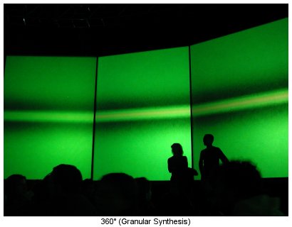 En marge des concerts, des expositions et de divers spectacles (théâtre, danse), ce nouveau festival multidisciplinaire dédié aux arts numériques voyait la Grande Halle de la Villette occupée par diverses installations, dont 360°, la nouvelle création du duo autrichien Granular Synthesis que nous avions déjà pu voir à l’oeuvre lors du festival Exit de Créteil en 2000 avec la performance Pol.