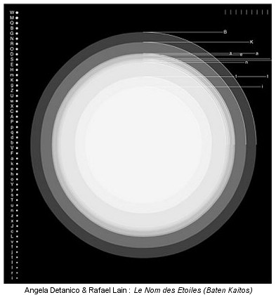 Poursuivant cette étude des rapports entre sémiologie, graphisme et art contemporain, Detanico & Lain nous offrent avec Le Nom des Etoiles une suite de travaux réalisés à partir des caractères typographiques de la police Helvetica. Partant du nom d’une étoile, ils utilisent la quantité d’encre nécessaire au tracé de chaque lettre de ce nom, dessinent un cercle avec chaque quantité et disposent ces cercles concentriquement de manière à créer une sorte d’étoile jouant sur les camaïeux de gris. Très réussie, cette dizaine de représentations se voit également dotée d’un vocable propre : Helvetica Concentrated.