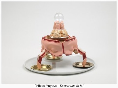 De fait, c’est carrément le mauvais goût qui est mis ici à l’honneur, de manière totalement assumée par l’artiste du reste : gâteaux faits à base de doigts et d’yeux (la série Savoureux de toi), tableau présentant une vulve enserrée dans un épi de maïs ceinturé pendant que pleuvent lardons et petits pois (L’origine de l’immonde), coucous faits de pubis dotés de volants type french cancan et de plumes battant des ailes, masques d’animaux ornés de lauriers dorés. Se complaisant dans des propositions choque-bourgeois ne dépassant pas ce petit stade et installant un décorum pompier (tapis rouge, faux marbre, rose et or comme teintes dominantes), Philippe Mayaux peut cependant se faire plus cocasse par moments. Ainsi certaines de ses chimères (grandes reproductions de toiles collées à même le mur) font sourire à l’image de celle où un singe et un cheval taillent le bout de gras autour de quelques braises (T’as du feu ?). En revanche, on passera rapidement sur les jeux de mots très faciles régulièrement utilisés : de L’origine de l’immonde déjà évoqué, à la série de tableaux représentant des écorces d’arbres et nommés Boulot, Être ou Si Près.