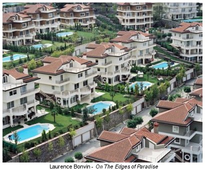 Plus percutante encore dans ce domaine, Laurence Bonvin nous propose une série de seize photographies intitulée On The Edges of Paradise. Traduisant avec force négation des particularismes locaux, standardisation et désir sécuritaire, ces clichés représentent les « Gated Communities », ces quartiers résidentiels ultra-protégés : maisons identiques (à l’échelle de piscine près), caméras de surveillance, chiens de garde, fils barbelés, hauts murs d’enceinte. Pouvant se situer aussi bien en Amérique, en Australie, qu’en Afrique du Sud, ces habitations ont en fait été construites un peu à l’extérieur d’Istanbul, alors qu’à quelques hectomètres d’elles, les HLM et terrains vagues se noient dans la grisaille. Ce coup de projecteur sur cette forme d’uniformisation vient ainsi s’inscrire judicieusement dans le débat actuel sur les différences entre la Turquie et le reste de l’Europe.