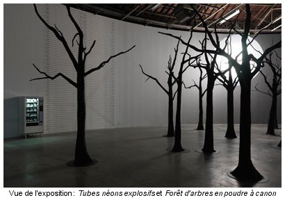 À force d’avoir entendu et lu un peu partout que cette dernière n’était qu’un assemblage de pièces décalquées des plasticiens les plus marquants des années 90 (la moquette de M/M, les arbres calcinés repris chez Ugo Rondinone, les pupitres lumineux qu’avait utilisés Philippe Parenno, etc…), on pénètre avec précaution l’espace d’exposition. Dans une pénombre certaine (due au fait que notre visite s’effectua alors que l’exposition était en mode « off » avec faible lumière et absence de bande-son), nous fûmes frappés par la trituration de l’espace réalisée par Loris Gréaud. De fait, de la sculpture en néon, reprenant et compactant les plans du Palais de Tokyo (Distorsion de l’espace), à la faille spatio-temporelle que constitue la reprise, pièce pour pièce, de son exposition de 2005 au Plateau, en passant par Spectacle d’une sculpture, espace dans l’espace, dans lequel s’affrontent (lorsque le lieu est en mode « on ») des joueurs de paint-ball, il s’agit de mettre en place des unités quasi-isolées, de compartimenter tout en s’appropriant l’intégralité des salles du Palais de Tokyo. Tout aussi intéressant, le travail sur la décomposition par le feu se fait récurrent : Feu d’artifice sous la terre (moulage, mis au plafond, du sol après le tir d’un feu d’artifice souterrain), Tubes néons explosifs (disposition de 140 tubes qui exploseraient s’ils étaient branchés, le néon ayant été remplacé par du propane) et Forêt d’arbres en poudre à canon (les fameux arbres calcinés) interrogent ainsi ce processus qui permet, après désagrégation, de donner naissance à quelque chose d’autre. Enfin, doit être saluée l’interactivité de Cellar Door, dotée d’un « expo-jockey » placé dans une cabine à l’entrée et chargé de moduler lumières et sons de chaque salle, d’un court-métrage (Film pour le vide) qui n’est projeté que lorsque la pièce l’accueillant est vide ou d’une absence de véritable sens de circulation conduisant le spectateur à déambuler à sa guise.