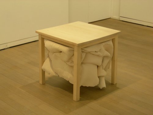Lorsqu’ils n’entreprennent pas de peindre un univers allant doucement vers sa propre décrépitude, les plasticiens se font fort de réduire le monde et de circonscrire leur environnement immédiat dans leurs créations. Stéphane Vigny reproduit ainsi en plus petit un pylône EDF qu’il couche ensuite sur le sol, Évariste Richer travaille fossile et pierre pour symboliser l’Himalaya tandis que Guillaume Leblon dispose une large palissade qui ne parvient cependant pas à s’élever, en hauteur, à sa taille « adulte ». Poussant un peu plus cette approche, Dove Allouche aplatit sur ses dessins des reproductions photographiques documentaires alors que Katinka Bock veut, avec son installation précédemment décrite, montrer un « paysage sous une table » (Landschaft unter der Tisch).