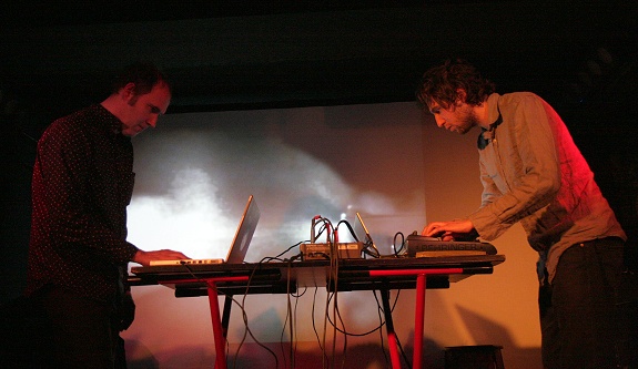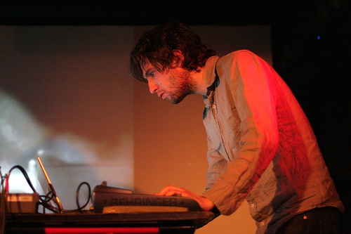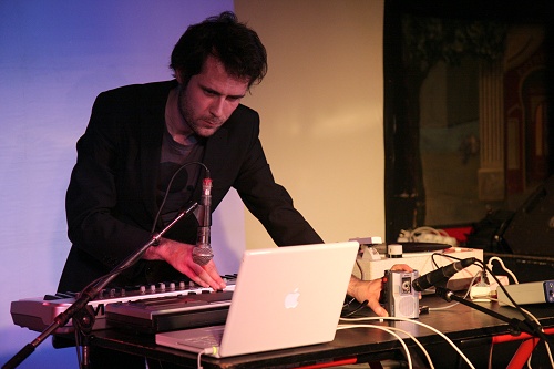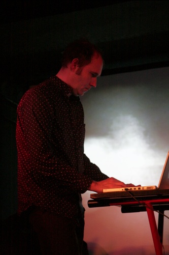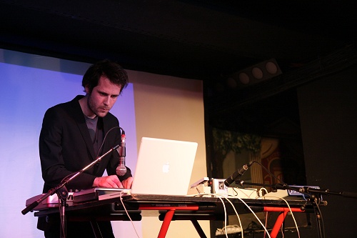 Break donc, un petit verre, et on attaque la deuxième partie de soirée en commençant par Pierre-Yves Macé dont on écoutait le dernier album quelques jours auparavant. Son concert était une présentation de ce nouvel album, Passagenweg, basé sur des enregistrements de musique des années 20-30 qui étaient diffusées dans les passages parisiens. Il s’agit donc d’un set de musique concrète construite par collages et traitements de ces musiques, coupé de cassures et craquements. Le jeune français se produit au laptop, platine et lecteur cassette dont l’utilisation nous rappellera parfois Aki Onda (avance rapide tout en maintenant la lecture notamment). Un set très proche de l’album sur lequel on reviendra très prochainement, alternant douces mélodies et séquences plus abruptes.