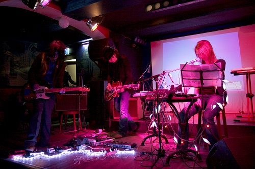 Ouverture de la soirée avec Thierry Théolier pour une introduction que l’on qualifiera de conceptuelle, nommée Statuts Quo, inspirée de l’écriture automatique et connectée à nos nouveaux modes de communication. A vrai dire, on est certainement peu adepte des concepts que l’on nous explique, comme pour donner de la contenance à ce qui n’en a pas forcément. La prestation était partagée entre Thierry Théolier, Aurore Molière en tant que lectrice, un ordinateur, mais la musique, ambient concrète plutôt classe était apparemment produite par Eric Périer. C’est sur cette musique que sont lus des statuts Facebook (pour ceux qui ne seraient pas encore sur LE réseau social, ces statuts dont des petites phrases allant de la simple pensée du moment à l’action que l’auteur est en train de mener), parfois amusants, souvent répétitifs, se répondant finalement trop rarement pour que l’ensemble fonctionne réellement. Pendant ce set on se connectera justement sur notre compte Facebook et on changera notre statut en "EtherREAL Webzine est en train d’écouter une lecture de statuts Facebook", mais il aurait fallu que Thierry Théolier lise notre statut, histoire de boucler plutôt que de finir en eau de boudin.