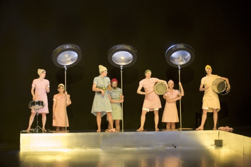 Au-delà de ce travail, le spectacle s’interroge en creux sur l’image sociale de la femme : de son titre (on ne sait s’il s’agit d’assistantes sociales, d’assistantes maternelles, d’assistantes esthéticiennes ou autres…) aux tenues arborées (robes en vichy rose, mauve ou vert amande, bonnets, boots) en passant par les accessoires utilisés (projecteurs semblables à des casques séchoir, huile de massage), l’esthétique un peu rétro qui emprisonnerait les protagonistes est gentiment raillée. Pour autant, l’universalité peine à naître d’une représentation qui souffre par ailleurs de longueurs indéniables, comme la lecture in extenso de la note d’intention bien que celle-ci ait été disposée préalablement sur les sièges du public. Restent néanmoins une sympathique impression de légèreté et quelques moments plus réussis, à l’image de cette moquerie du discours critique lorsque chaque danseuse commente, avec force circonvolutions verbeuses et constructions alambiquées, le mini-solo effectuée par l’une d’entre elles.