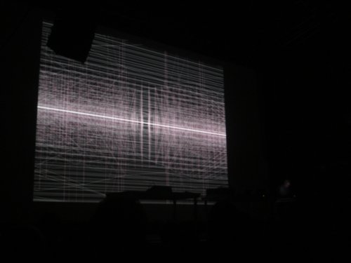 Après une très (trop) brève pause, c’est son compatriote Frank Bretschneider qui prit place sur scène. Cela fait longtemps que nous pensons le plus grand bien de l’auteur des intéressants disques minimaux que sont Rand et Curve sortis chez Mille Plateaux. Mais c’est sur la pléthorique structure de Chemnitz - dont il est le co-fondateur avec Carsten Nicolai et Olaf Bender, aka Byetone – que l’Allemand a proposé il y a deux ans l’excellent Rhythm, dont sa performance de ce soir s’inspira très largement (et sur lequel, rétrospectivement, nous regrettâmes de ne pas nous être penchés plus tôt). C’est peu de dire qu’il asséna une véritable claque à l’assistance subjuguée : d’un bout à l’autre de son trop court set, pas une note, pas un développement, pas une transition ne purent être pris en défaut. Maîtrisant son sujet avec une rigueur absolue, Bretschneider délivra une galaxie de sons tantôt cristallins, tantôt opaques, allant de lignes pures à des structures plus complexes, presque dansantes, superposant un nombre impressionnant de couches et de fréquences toutes plus travaillées et impeccables les unes que les autres. Bien que le set entier fut mémorable, on mettra surtout en exergue ses deux premiers titres (A Soft Throbbing, morceau d’ouverture de Rhythm, et un autre du même acabit), parcouru de ces « vents électroniques », chers à notre cœur. Le tout était calé au millipoil sur des visuels époustouflants, bien différents de ceux d’Alva Noto, composés principalement de lignes en constantes variations au gré des notes sur lesquelles elles se fixent, en flux et reflux, en ondes spatio-maritimes, parfois parcourues de quelques flashes blancs. La toute grande classe, une prestation qui conquit probablement tout le monde et qui fut à juste titre très applaudie. Très probablement le meilleur concert de l’ensemble du festival.