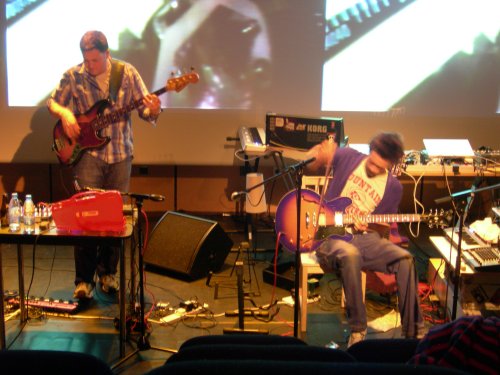 Après une courte pause, place à l’événement qui avait principalement motivé notre déplacement : la prestation live d’Origamibiro, ce duo anglais mené par Tom Hill et auteur d’un bon album d’electronica-folk paru il y a deux ans sur Expanding Records. Accompagnés de The Joy Of Box (Jim Boxall) à la vidéo, les musiciens s’installèrent au milieu de plusieurs instruments pour deux suites de morceaux enchaînés et construits sur le même schéma. La base rythmique fut créée à partir du découpage d’une enveloppe en carton, du froissage et du déchirage d’une feuille de papier, ou bien des sons produits par la frappe sur une machine à écrire ; ces boucles rythmiques furent ensuite rejointes par des lignes mélodiques réalisées par une guitare acoustique jouée en picking ou à l’archet, par un ukulélé, un Glockenspiel, une basse, une guitare électrique ou un clavier. On obtint alors une electronica-folk particulièrement réjouissante non seulement car on en a vu le processus de création en direct, mais aussi car, intrinsèquement, cette musique s’avère rayonnante et accrocheuse. Sur le plan visuel en revanche, passés les instants où la fabrication de la rythmique est projetée sur l’écran, on trouva les vidéos un peu trop sursignifiantes : enfants qui courent en sortant de l’école quand la musique se fait plus légère, visages entrevus et image saturée quand les mélodies cessent pour laisser davantage de place aux textures grésillantes, etc… Après ces deux successions de morceaux, place à Unknown in the Walls, pièce plus sombre et inquiétante, avec la guitare acoustique jouée à l’archet oeuvrant en solo, tandis qu’un personnage esseulé et apeuré erre dans une maison à l’abandon. Pour terminer cet excellent concert, retour au schéma précédemment évoqué avec Vitreous Detachment (autre titre extrait de l’album). Musicalement plus mélancolique (tempo plus languide, ensemble moins enlevé), ce morceau bénéficia lui aussi d’une rythmique créée live, via cette fois-ci le feuilletage d’un livre ou le passage d’un capteur sur le sol. Inventivité et imagination étaient donc les maîtres-mots de cette belle soirée.