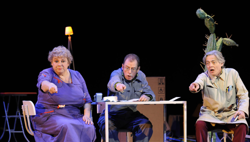 Néanmoins, Oxu n’échappe pas complètement à ce que l’on pourrait appeler le syndrome « première gorgée de bière », cette magnification des petits riens du quotidien et la douce mièvrerie complaisante qui s’ensuit. Emportés par leur enthousiasme, soutenus par les rires d’un public conquis d’avance (à peine la première réplique prononcée, une bonne partie de la salle s’esclaffait), les comédiens versent ainsi par endroits dans une certaine facilité. Fort heureusement, le spectacle ne se limite pas à cet exercice de remplissage de dictionnaire puisque quelques chansons le parcourent et que Jean-Claude Leguay, Christine Murillo et Grégoire Œstermann se livrent également à une délectable recherche des phrases « qu’on a jamais dites », pour la simple satisfaction d’enfin les énoncer. Tandis que le premier relève que « on va avancer le conseil des ministres », il ne l’a jamais formulé, le dernier note qu’il n’a jamais prononcé « sellez mon cheval » (pourtant bien pratique, continue-t-il, cela permet de signifier un départ courroucé et une volonté de mettre fin abruptement à une conversation) et la comédienne, femme un peu forte, avance n’avoir jamais dit « il est un peu large, vous ne l’auriez pas en 34 ? ».