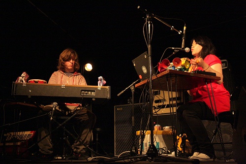 Rapide changement de plateau (environ 10mn entre chaque groupe) et on enchaine avec Bird and Bear, un duo formé par un jeune homme au clavier vintage et une jeune femme au laptop et instruments jouets. Ils ont opté pour une introduction complexe, expérimentale où se mêle une multitude de bruitages, pour rapidement s’orienter vers une formule plus pop, tantôt rétro, tantôt naïf, avec un chant aux intonations parfois folk. Le mélange est original, léger, évoquant des musiques des années 50, les fêtes foraines quand le clavier se rapproche de l’orgue de barbarie, et si le groupe manque clairement d’assurance, il dégage aussi un certain charme.