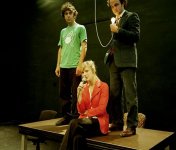 Romancier anglais, Will Self voit l’une de ses pièces (Vice-Versa, intitulée Cock and Bull en VO, nous y reviendrons) adaptée au théâtre par un trio (Sophie Cattani, Antoine Oppenheim et François Sabourin) qui se charge également de la mise en scène et du jeu. Dans cette courte pièce (une heure au cordeau), il s’agit de suivre un jeune homme (John Bull) qui se rend chez son docteur (Alan Margoulies) car il s’inquiète d’une sorte de plaie ou de blessure apparue derrière son genou gauche.