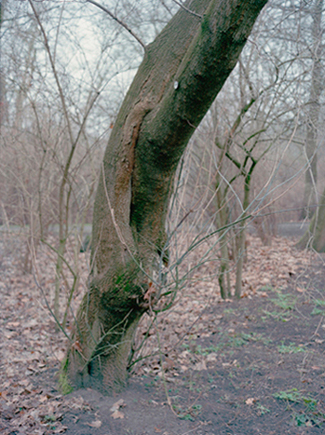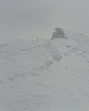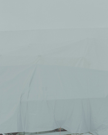 La différence entre chaque diaporama est du coup très subtile. A chaque fois des corps et portraits de jeunes gens aux physiques souvent androgynes et peaux immaculées, des paysages désolés dont on ne retient finalement que le minimalisme graphique (une ligne d’horizon, un sommet enneigé qui se confond avec un ciel brumeux), des statues de marbre blanc qui font écho aux corps, des enchevêtrements naturels (branchages noueux, troncs qui fusionnent, broussailles) et des voiles, bâches ou drapés, tantôt pris en situation, tantôt source de jeu pour rendre un corps invisible tout en gardant l’être présent, devenu fantomatique. C’est bien là que l’on situera la principale préoccupation de Dorothée Smith, la disparition et l’oubli.