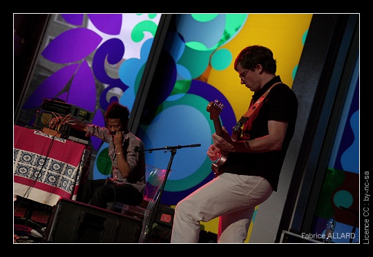 Après leur passage plus que convainquant l’an dernier à Mains d’Œuvres, faire le déplacement à la Fondation Cartier pour revoir White/Lichens était comme une évidence. White/Lichens est la réunion de deux projets. White/Light d’un part, duo composé de Jeremy Lemos aux synthétiseurs et machines, et Matt Clark à la guitare, absent l’an dernier à Mains d’Œuvres. Lichens est le nom du projet solo de Rob Lowe. Tout ce petit monde est originaire de Chicago, joue et collabore avec plusieurs groupes (dont TV On the Radio pour Rob Lowe !), Jeremy Lemos ayant fondé son propre studio d’enregistrement.