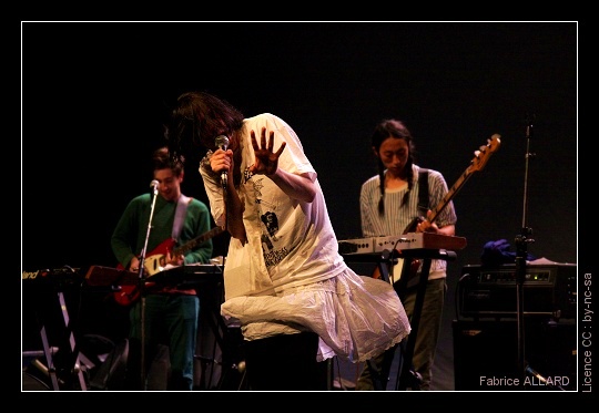 C’est vers 21h10 que débute le live d’Ariel Pink en formation élargie dans le cadre d’une tournée mondiale, véritable groupe avec batteur, guitaristes, bassiste et clavier. Le démarrage est un peu chaotique, à se demander si le concert a vraiment débuté... chaque musicien esquisse quelques notes, Ariel quitte la scène, certainement pour aller chercher quelque chose qu’il aurait oublié, bref, on ne comprend pas trop ce qui se passe. Et puis il revient avec son attitude un peu jemenfoutiste, déglingué, rock’n roll quoi... On ne connaissait Ariel Pink que de nom, peu intéressé rien qu’à l’idée de les voir signés chez Paw Tracks, label d’Animal Collective. C’est en effet pas vraiment notre tasse de thé. Ballades pop, rock FM 70s, la première référence qui nous vient à l’esprit sont les Beach Boys. C’est léger, ensoleillé, mais approximatif, donnant l’impression de mener son live un peu par dessus la jambe. Le public est partagé, avec des fans admiratifs et l’impression que certains prennent ça pour du foutage de gueule, lançant leur gobelet sur la scène et commençant à créer une certaine tension dans la salle... on se demandera si c’était du lard ou du cochon, une partie du public restant près de la scène, prête à se lancer dans un duel déjà calculé avec l’artiste.