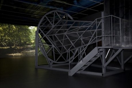 Dans le prolongement de HAARP, cette forêt de pylônes montrée au Palais de Tokyo dans le cadre de la session Gakona l’hiver dernier, Laurent Grasso présente The Horn Perspective, installation principalement composée de deux antennes et d’une projection vidéo. On sait l’artiste français très amateur de ce medium qui lui avait notamment permis de rafler la mise lors de l’édition 2008 du Prix Marcel Duchamp, récompense qui lui vaut l’honneur de cette monographie en l’Espace 315 du Centre Pompidou.