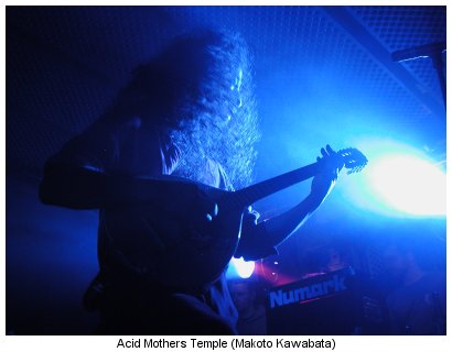 Les Pardons se voient ensuite rejoint par les trois autres membres de Acid Mothers Temple, dont Makoto Kawabata qui commence avec une superbe intro au bouzouki. On se retrouve immédiatement projeté 30 ans en arrière avec une musique hautement psychédélique, une rythmique reprise depuis par des groupes post-rock qui s’accélère petit à petit jusqu’à ce que Kawabata délaisse le bouzouki au profit d’une guitare électrique qui se fera rageuse tout en reprenant régulièrement le thème du morceau. On regrettera un peu ce type de passage où le leader du groupe joue un peu les guitar-heroes. Changement brutal d’ambiance, passage nerveux laissant place au calme et à la mélodie avant de repartir de plus belles, et de très long morceaux, comme le veut le genre, seront des point communs à la plupart des morceaux du concert.