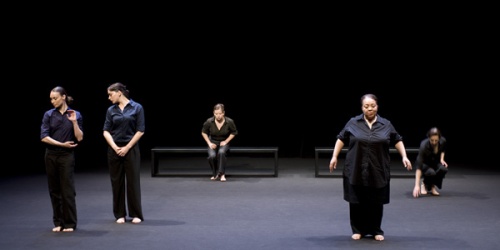 Malheureusement, et les quelques lignes précédentes pouvaient déjà le laisser pressentir, on se trouve en réalité en face d’un propos globalement trop convenu, avec cet éternel travail sur la représentation, mû par une volonté universaliste que traduisent un plateau nu (hormis deux bancs en fond de scène), une tenue quasi-uniforme des cinq danseuses (chemise noire ou bleue foncée ou violette, pantalon noir, pieds nus) ou des cheveux tous tirés en arrière. On en vient même à se demander ce qu’il reste véritablement du travail d’Herman Diephuis une fois mis de côté les habituels mouvements simultanés des intervenantes (la réaction panurgique comme aliénation de l’individu), les illustrations appuyées de chansons pop (un sein caressé, une langue vulgairement tirée), la succession de poses renvoyant aux vierges de la Renaissance et aux mannequins actuels ou la diffusion saccadée de tubes (Crazy In Love, Toxic, Dancing Queen) avec zapping à chaque changement de direction d’une danseuse.