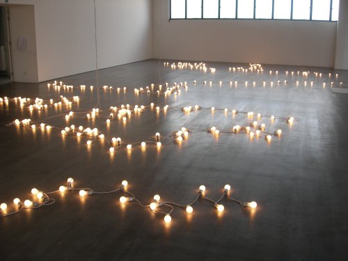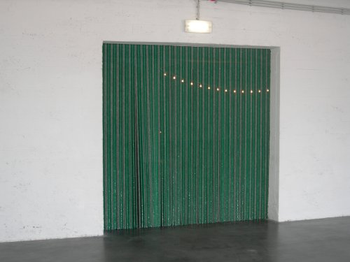 Si l’idée de réinstaller une exposition au milieu de sa durée de présentation est tout à fait louable et séduisante, on peut cependant déplorer qu’elle s’accompagne d’une réduction du nombre d’œuvres montrées (dix-sept contre quarante-six dans la « version Filipovic »), renforçant l’impression ressentie à chaque venue au Wiels d’une sous-utilisation regrettable de tous ses espaces. Néanmoins, on peut aussi objecter que ces grandes salles quasi-vides renvoient indirectement à l’absence laissée par le décès de l’artiste. Afin de passer d’une pièce très sombre juste éclairée par une de ces fameuses guirlandes d’ampoules (Untitled (Summer)) à un espace ultra-lumineux grâce aux larges baies vitrées donnant sur l’extérieur, le spectateur est tenu d’écarter un rideau de perles (Untitled (Beginning)). Métaphore évidente du passage de vie au trépas, on le traverse en se demandant si l’espace sombre représente la mort et l’autre la vie, ou l’inverse.