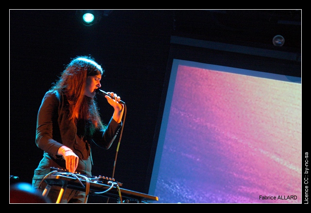 Une quinzaine de minutes de break, le temps pour Julianna Barwick d’installer son matériel, et voici le deuxième set. Il s’agissait là d’une parfaite première partie pour Eluvium, d’une belle introduction ambient. La jeune femme originaire de Brooklyn est debout derrière un pupitre recouvert de machines lui permettant en particulier de créer des boucles et d’appliquer des effets. Sa principale source sonore est sa voix, fredonnant quelques vocalises qu’elle transforme rapidement en de véritables chœurs éthérés, superposés à l’infini. L’américaine possède une superbe voix, douce, que les effets ne font qu’enjoliver. Ça fonctionne donc à merveille auprès des amateurs du genre, et on pensera assez souvent aux Cocteau Twins avec ce mélange de reverb et d’abstraction vocale.