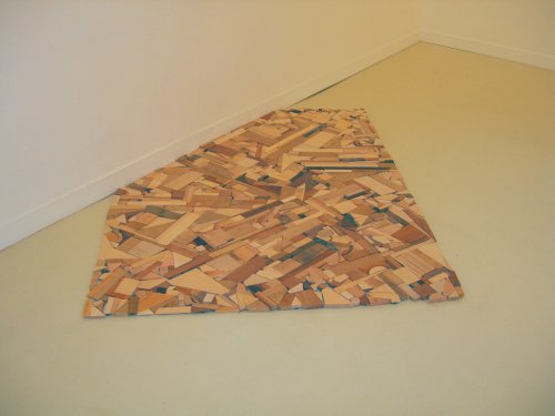 Globalement probante, cette démarche laisse quand même prépondérantes les thématiques chères à Geffriaud et dont on avait déjà pu apercevoir les contours : attachement à la matière et travail sur l’écrit et le document. La Lance en époxy qu’il a confectionnée avec Alex Cecchetti et la surface de bois réalisée avec Géraldine Longueville traduisent son goût pour la matière et la manière dont elle peut être agencée ou transformée. Ainsi, la lance fabriquée en pâte donne l’impression d’être taillée en bois et prête à être maniée par des chasseurs préhistoriques, tandis qu’Anti-Dumpty démontre que des copeaux de bois, a priori destinés à être inutilisés, peuvent constituer une aire plane entre radeau de fortune et découpe soignée.