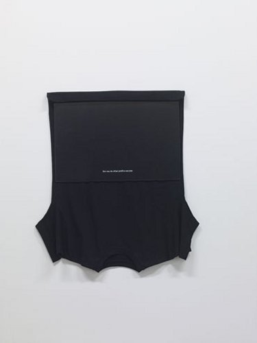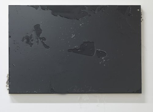 Précisément, le travail sur la matière s’avère souvent particulièrement probant (plus, en tout cas, que les monochromes de Stéphane Kropf) surtout parce qu’il conduit à des réalisations imparfaites, pleines d’aspérités et loin de tout caractère lisse et bien soigné. Ainsi, l’apposition de verre liquide sur un châssis en bois par Jutta Koether produit un superbe effet de relief (Untitled (Bitches Brew, Black Version #2)), le grand tissu de Michael Riedel se trouve déchiré en son milieu (Four Proposals for the Change of NOIRS in the Title of the Show MIROIRS NOIRS) et le jeu sur la géométrie des lignes de Wade Guyton casse l’aspect uniforme du noir et blanc.