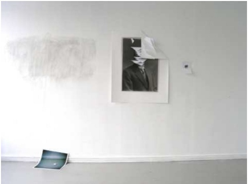 Le montage peut également résulter d’une forme de parasitage d’images existantes lorsque Wade Guyton imprime en surimpression des motifs colorés sur des pages de catalogues et magazines ou bien quand Jimmy Robert déchire une autre page de catalogue et l’accroche telle quelle, dans une mise en abyme à la fois distancée et révérencieuse (Still Life). Enfin, le même Jimmy Robert dispose le long d’un mur plusieurs composants (boulette de papier, texte effacé à même le mur, portrait s’étant vu rajouté quelques morceaux de papier) et interroge alors la combinaison de ces éléments : fausses traces d’une performance passée ? préambules à quelque chose qui va arriver ? Là encore, liberté est heureusement laissée au spectateur de se faire son idée.