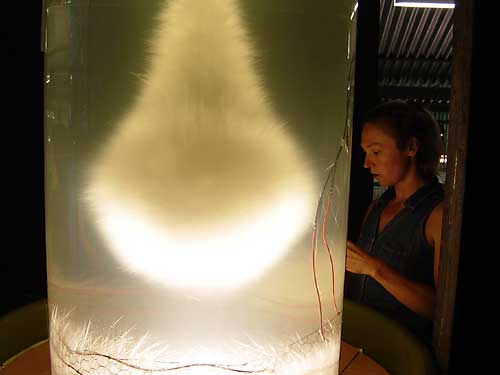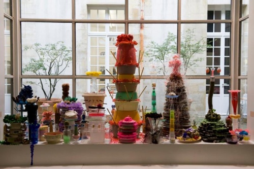 Mais, en face, l’armoire Jardin des Tortures contrebalance le propos avec quelque chose de plus poétique, limite naïf dans son accumulation de fleurs colorées et leur disposition dans un espace nous donnant presqu’envie d’y pénétrer pour intégrer un monde bariolé. Même réussite dans la Project Room, située de l’autre côté de la cour du Centre, avec Le Cristallisateur, agglomération de cristaux d’engrais formés au fur et à mesure du déroulement de la réaction chimique. Entre étude botaniste et renvoi à un fœtus plongé dans du liquide amniotique, cette création constitue une parfaite illustration du titre de l’exposition, désireux de se confronter à la fertilité sous toutes ces acceptions (reproduction humaine, fécondité de la terre, richesse de l’imagination).