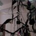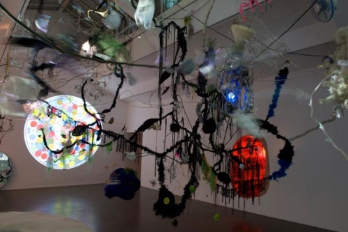 Enfin, la salle à l’étage se rallie en traversant un espace cloisonné entre cabane de jardin et atmosphère style maison des horreurs d’un parc d’attractions, comme s’il s’agissait d’opérer une vraie coupure avec l’extérieur. De fait, le grand espace est pensé comme un monde à part, avec ses tuyaux, disques de lumière projetés sur le mur à la manière de soleils psychédéliques, branches végétales et ustensiles de cuisine greffés sur ces dernières. Les cimaises percées d’ouvertures cassent le rythme habituel de visite du lieu tandis qu’une large banquette ronde accueille les visiteurs prêts à s’immerger dans cet univers assez singulier.