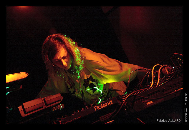 En tête d’affiche, Stellar OM Source, le projet solo de la française Christelle Gualdi actuellement basée aux Pays-Bas. Les machines sont à l’honneur ce soir et la Française apparaît derrière une pile de synthés et autres appareils électroniques. Elle débute son set avec des claviers aux consonances kraftwerkiennes et on percevra dans une premier temps une tendance psyché qui disparaîtra un peu alors qu’une rythmique lourde fit son apparition pour ne plus jamais s’arrêter. Celle-ci est assez basique, mais ce n’est pas vraiment là la marque de fabrique de Stellar OM Source. En fait on aura un peu de mal à situer l’artiste qui semble jouer sur deux tableaux à la fois : d’un côté, une débauche de claviers analogiques produisant boucles, arpèges et nappes, un maelström synthétique et psychédélique qui se mariait plutôt bien à des éléments influencés par une techno-trance.