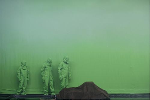 Qu’allait bien pouvoir proposer Philippe Quesne après la réussite éclatante qu’avait constituée La Mélancolie des Dragons ? En découvrant le plateau de Big Bang avec ses tentures et sol blancs, sa forme quasi-montagneuse placée côté cour et ses bureau et chaises côté jardin, on retrouve un univers immédiatement familier. De même, on ne sera pas dépaysé avec la présence de ce qui fait traditionnellement le charme des spectacles du Français : goût pour le décalé absurde dans cette évocation de la création de l’univers (des hommes des cavernes aux naufragés échoués), plaisir des petites machineries (même s’il abuse ici un peu des machines à fumée), du déguisement ridicule (cosmonautes et perruques récupérées de ses créations précédentes, respectivement D’Après Nature et La Mélancolie des Dragons) et de la mise dans le champ du hors champ théâtral (comédiens disant à haute voix « ça y est ? tout est prêt ? », « mets-toi là ou, non, plutôt là », etc…).