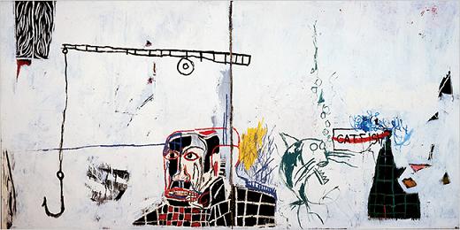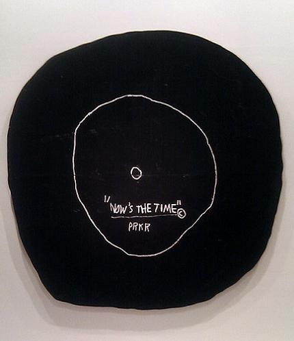 Réunis dans un accrochage qui cède à la facilité de la chronologie et ne nous épargne pas la salle de dessins et croquis en milieu d’exposition (à quand une monographie au Musée d’art moderne de la ville de Paris qui en fera l’économie ?), les travaux de Jean-Michel Basquiat s’attachent aux thèmes que l’on associe traditionnellement à la figure de l’artiste. Forte influence des cultures urbaines (graffiti, bande dessinée, street art), mysticisme plus ou moins inspiré de ses origines portoricaines et haïtiennes, engagement politique, questions liées à l’identité afro-américaine sont ainsi mêlés dans ses toiles. Pas de surprise de ce côté-ci, donc, ce qui nous conduisit à nous arrêter plus longuement sur des créations se faisant l’écho de ses goûts et découvertes musicaux, à l’image de l’hommage à un morceau de Charlie Parker réalisé sur une plaque de bois ronde et noire, comme un LP (Now’s The Time).