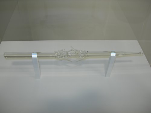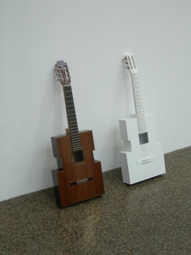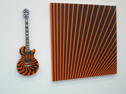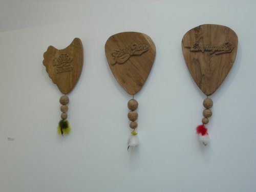 Précisément, codes et couleurs significatifs sont également utilisés, souvent pour les détourner dans une gentille ironie. John Armleder juxtapose ainsi Epiphone et peinture aux mêmes rayures oranges et noires, Francis Baudevin travaille à nouveau le rôle des logos et marques en s’en tenant aux quatre couleurs reggae tandis que Dewar et Gicquel agrandissent des médiators pour en faire des objets arts premiers. La transformation alors opérée trouve un écho dans la démarche d’autres plasticiens qui sont allés jusqu’à inventer eux-mêmes de nouveaux instruments. De la très belle baguette en verre de Vincent Kohler au double banjo d’Alighiero Boetti, des instruments en forme d’organes de Jim Shaw aux guitares cubistes de Valentin Carron, ce sont autant de créations décalées et, en apparence, inutilisables qui nous sont montrées. Dans deux mouvements opposés, Rainier Lericolais est parti d’un instrument à vent pour faire une suspension (Mobile) tandis que Michael Sailstorfer a confectionné une batterie avec les restes de carrosserie d’une voiture de police allemande (avec ses célèbres couleurs vert et blanc).