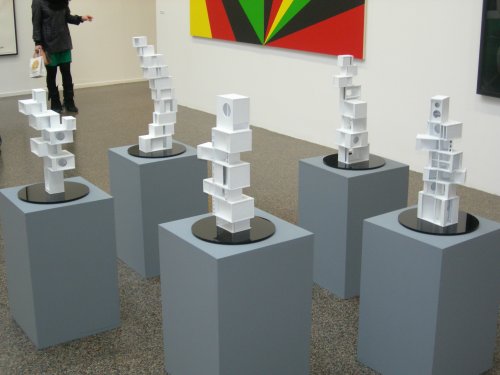 Par rapport à toutes les autres expositions « musicales » vues ces dernières années, une chose nous a frappé au cours de notre visite : le caractère non sonore d’Echoes. Parti pris revendiqué par l’équipe curatoriale, ce choix permet probablement de se concentrer davantage sur les créations plastiques. De toute façon, on ne voit pas bien comment de la musique aurait pu être diffusée puisque ce ne sont pas les enceintes en béton de Dominique Blais, les petits transistors, eux aussi en béton, d’Isa Genzken ou les amplis capturés en photo par Philippe Gronon qui auraient pu beaucoup nous aider. Et pourtant, le bow-window du Centre culturel suisse se trouve éclaté par Hugues Reip comme si, malgré tout, l’impact sonore avait bien eu lieu.