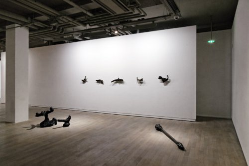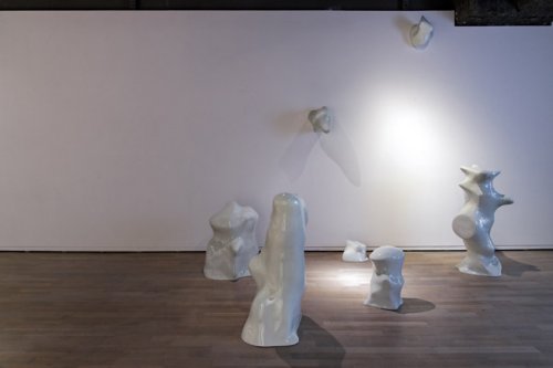 Ces ajouts conduisent évidemment ces objets à quitter leur fonctionnalité première et à être élevés au rang d’œuvre d’art, statut que revêtent également les moulages en céramique d’Anders Ruhwald (sorte de nuage soutenu par une canne), Philippe Terrier-Hermann (gros pois verts aux réminiscences asiatiques) et Vincent Kohler (morceaux zoomorphiques de branches de bois). Poursuivant ce processus, d’autres créateurs en viennent à réaliser des formes hybrides, échappant effectivement à toute identification : véhicule-miroir de Julien Discrit, tas couleur chair de Farida Le Suavé, tuyaux posés sur une table d’Hubert Duprat, sculptures à la blancheur phosphorescente de Fabrice Langlade et tapis de laine recouvrant une grosse balle de Florence Doléac.
