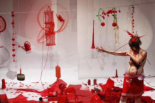 Quand la Québécoise pénètre sur le plateau, deux grands lais blancs sont déroulés et rien de rouge n’apparaît. Précisément, tout l’objet du spectacle va être d’extirper d’un grand flight case toutes sortes d’objets du même rouge vif en reprenant à chaque fois la même question : « What colour is this ? » et en y apportant la même réponse : « It’s red ! ». Pendant que la scène se trouve constellée d’ustensiles, bibelots et babioles, la déclamation de ces deux phrases prend diverses intonations, plus ou moins en accord avec la finalité utilitariste de l’objet considéré. En outre, ainsi qu’on pouvait s’y attendre, toute la gamme des acceptions et symboles de cette couleur est parcourue : rouge comme le sang, qui donne la vie mais est aussi synonyme de mort, rouge comme un cœur qui bat, rouge passion, rouge de la peinture (en tube, en bombe, appliquée ou projetée), etc…